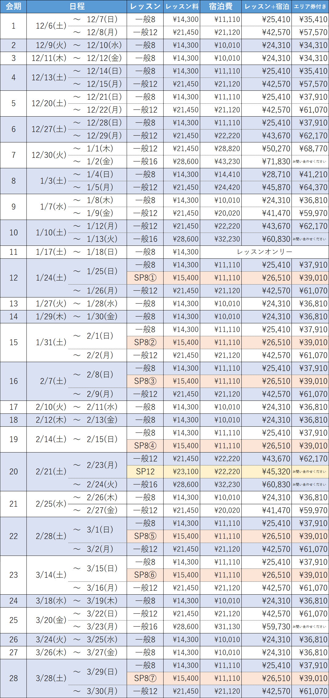 上記は消費税込みの料金となります。レッスン代には傷害保険代が含まれ、宿泊費は1泊につき2食付きの料金となります。